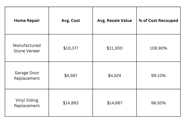 | Home Repair | Average Cost | Average Resale Value | Percent of Costs Recouped |